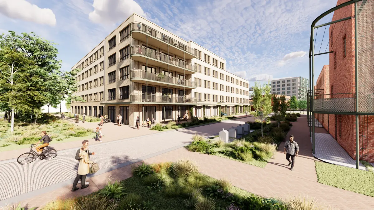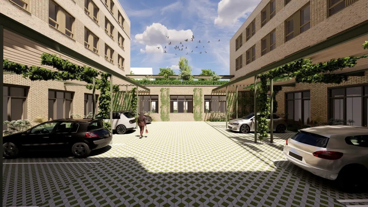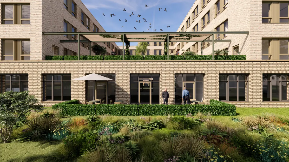 healthcare complex featuring 160 care homes, shared living spaces and a public plinth